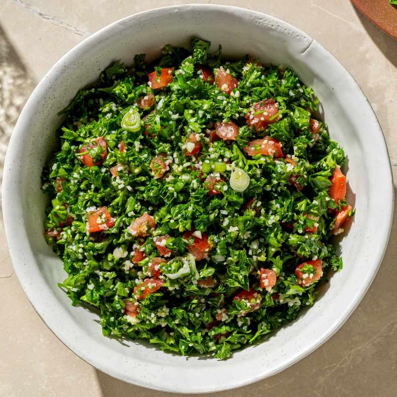 Made with finely chopped parsley, tomatoes, onions, mint, bulgur, olive oil, lemon juice, salt
